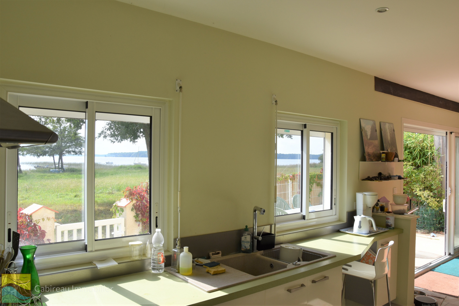 Lacanau (33680)En exclusivité. première ligne du lac, maison de plain-pied très lumineuse construite en 1970 rénovée en 2013 offrant une surface habitable de 82 m² sur une parcelle clôturée de 240 m². La maison dispose d'un séjour avec cheminée & poêle à granules ouvrant par une grande baie vitrée sur terrasse face au lac, cuisine équipée vue lac, 3 chambres, une salle de bains équipée d'une baignoire & douche, wc indépendant, cellier.