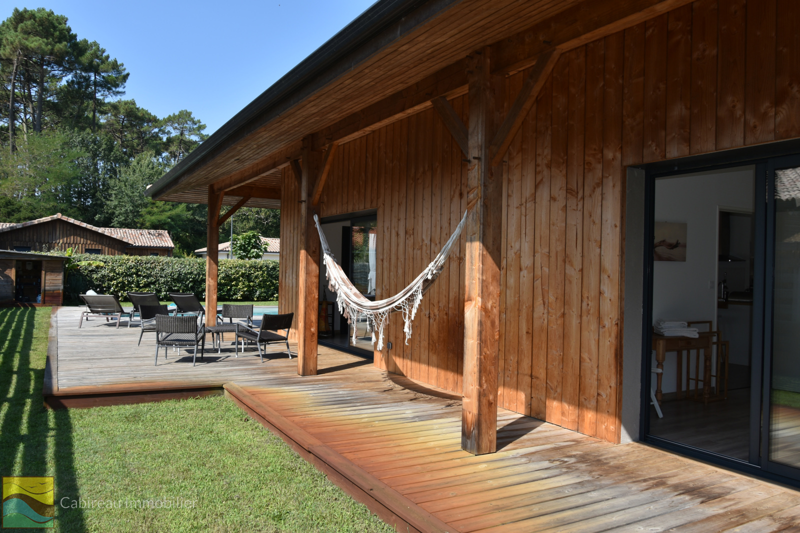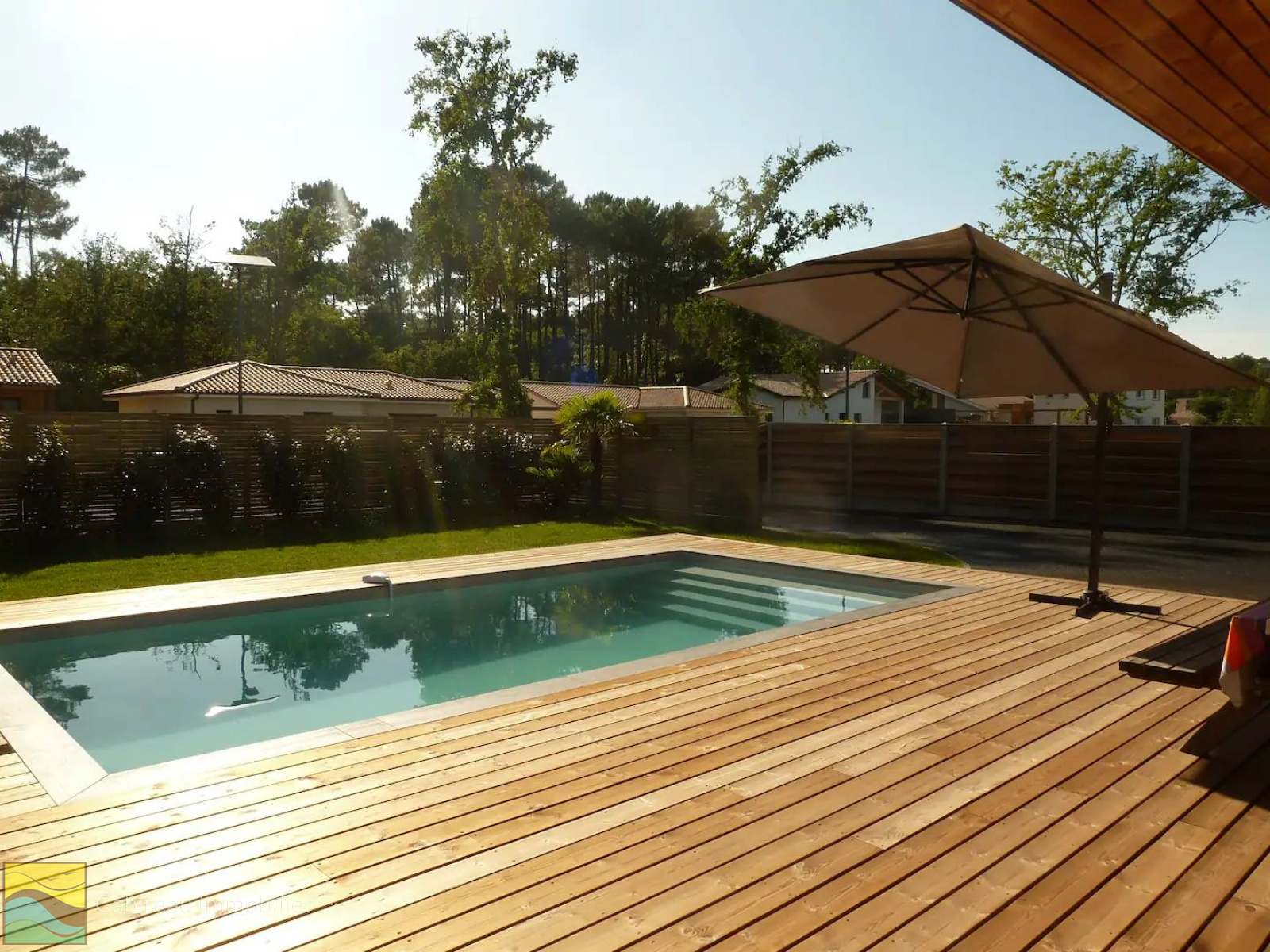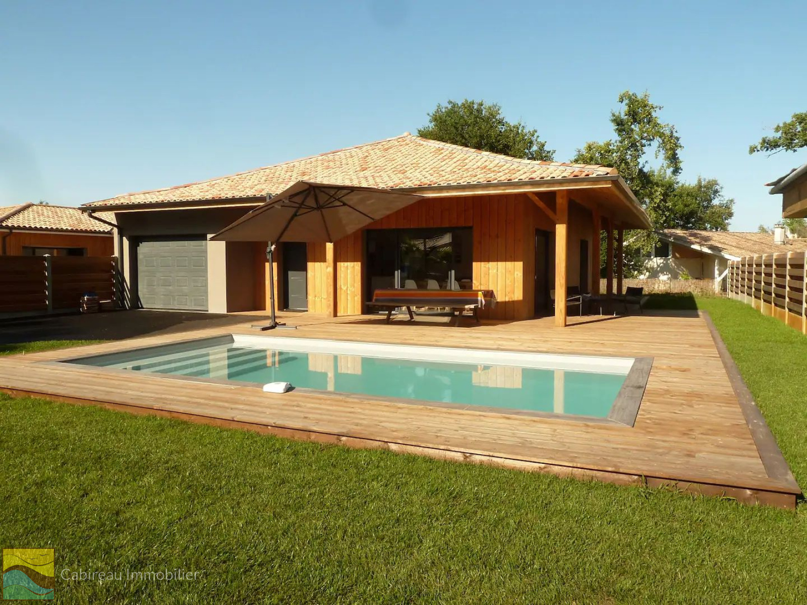 Lacanau (33680)COUP DE COEUR pour cette belle contemporaine construite en 2017 (en brique bardage en douglas) aux normes de la RT 2012 au calme, à deux pas du lac, proche centre-ville. La maison est de plain-pied, fonctionnelle, lumineuse pour une surface de 100 m² implantée sur une parcelle de terrain de 601 m² agrémentée d'une piscine chauffée et 2 terrasses en bois. Le bien se compose d'un spacieux séjour cuisine us avec clim reversible, suite parentale avec sa salle d'eau privative, 2 chambres, salle de bains, cellier et un WC séparé. Garagae attenant de 24 m².