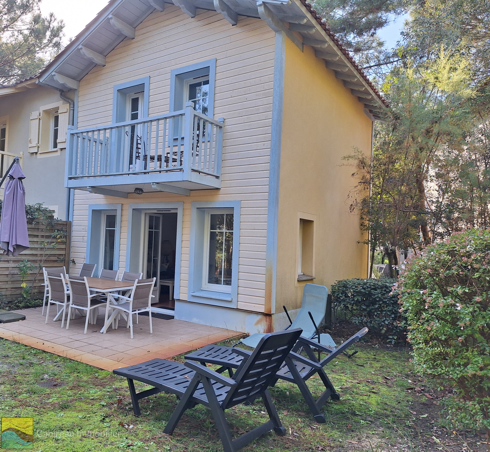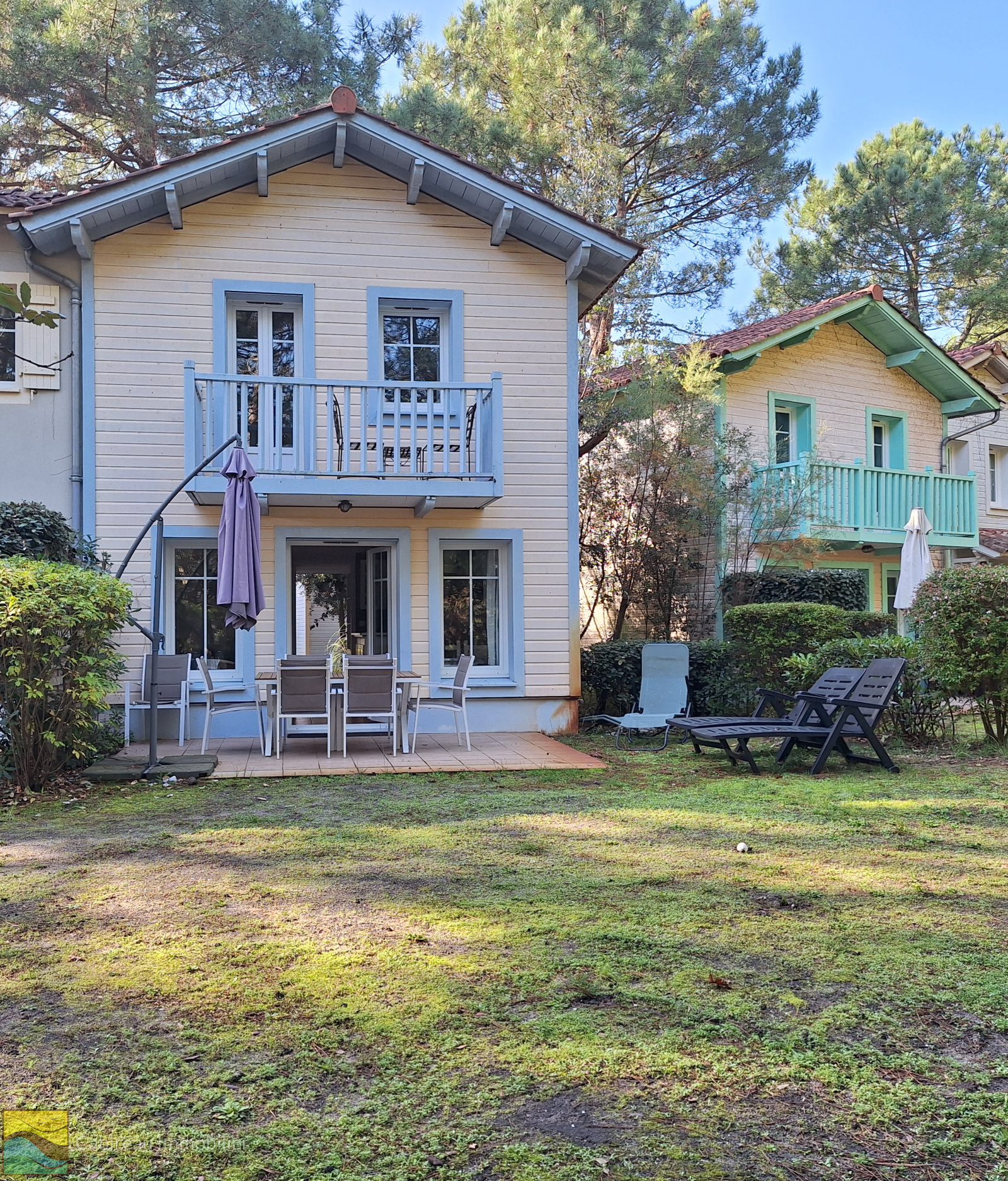 Lacanau ocean (33680)En exclusivité. Sur un site verdoyant avec piscine collective, belle maison à étage mitoyenne d'un côté très bien entretenue. Elle se compose au RDC d'une entrée, séjour-cuisine équipée ouvrant sur une terrasse avec vue dégagée sur espace vert, une salle d'eau WC. A l'étage, 2 chambres avec balcon, salle de bains WC.