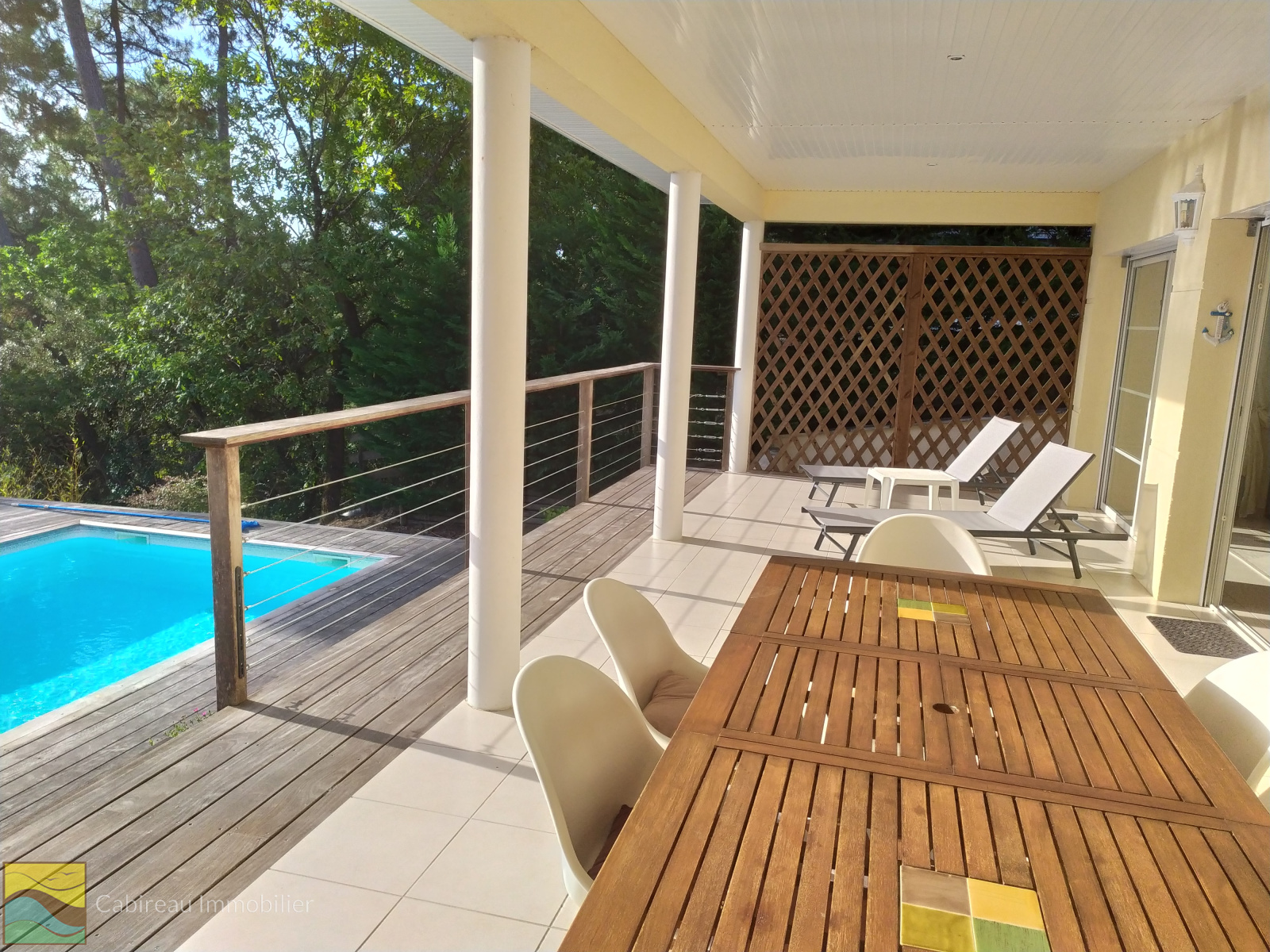 En surplomb d'une forêt domaniale à proximité du golf, maison construite en 2009 parfaitement entretenue sur une parcelle de terrain de 1089 m² avec vue panoramique à 180°, piscine au sel de 4x8 chauffée et bordée d'une terrasse en IPE.