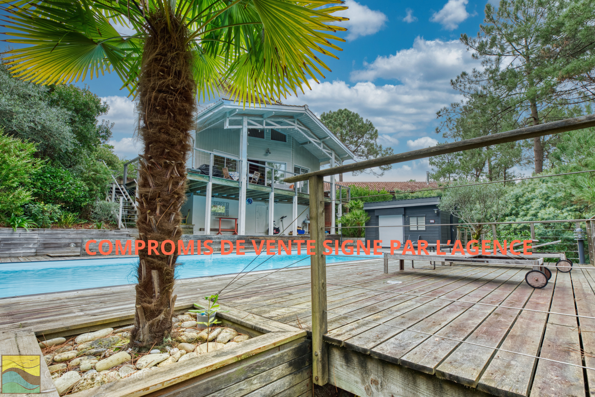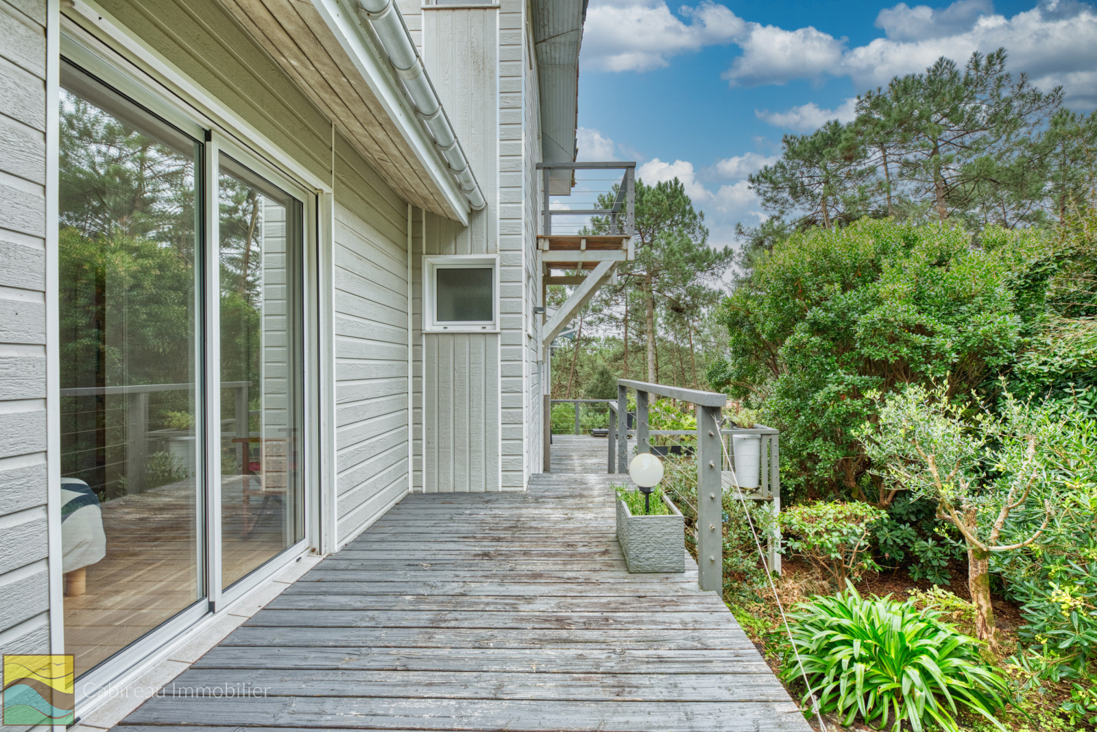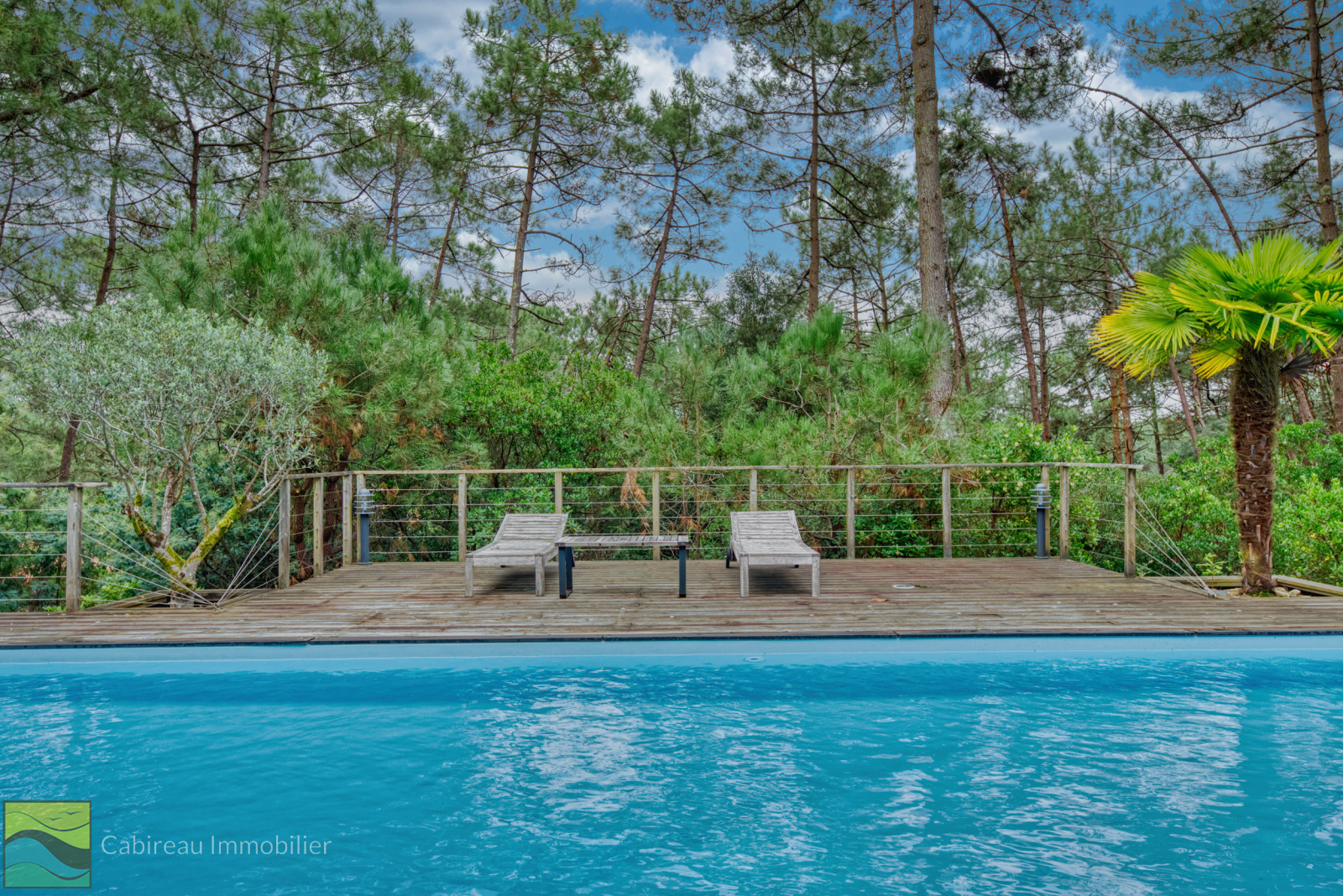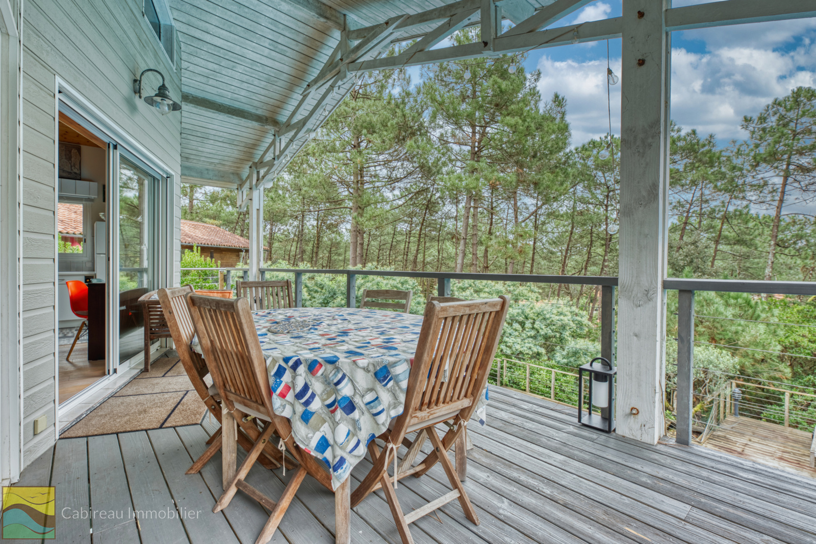 Lacanau ocean (33680)Dans un cadre naturel au cœur d'une pinède au calme, découvrez cette charmante maison à ossature bois construite en 1998, offrant une vue panoramique et un cadre de vie agréable. D'une surface habitable de 110 m², elle est implantée sur un terrain arboré de 1155 m², avec une piscine de 5x10 mètres entourée d'une vaste terrasse en bois de 126 m².