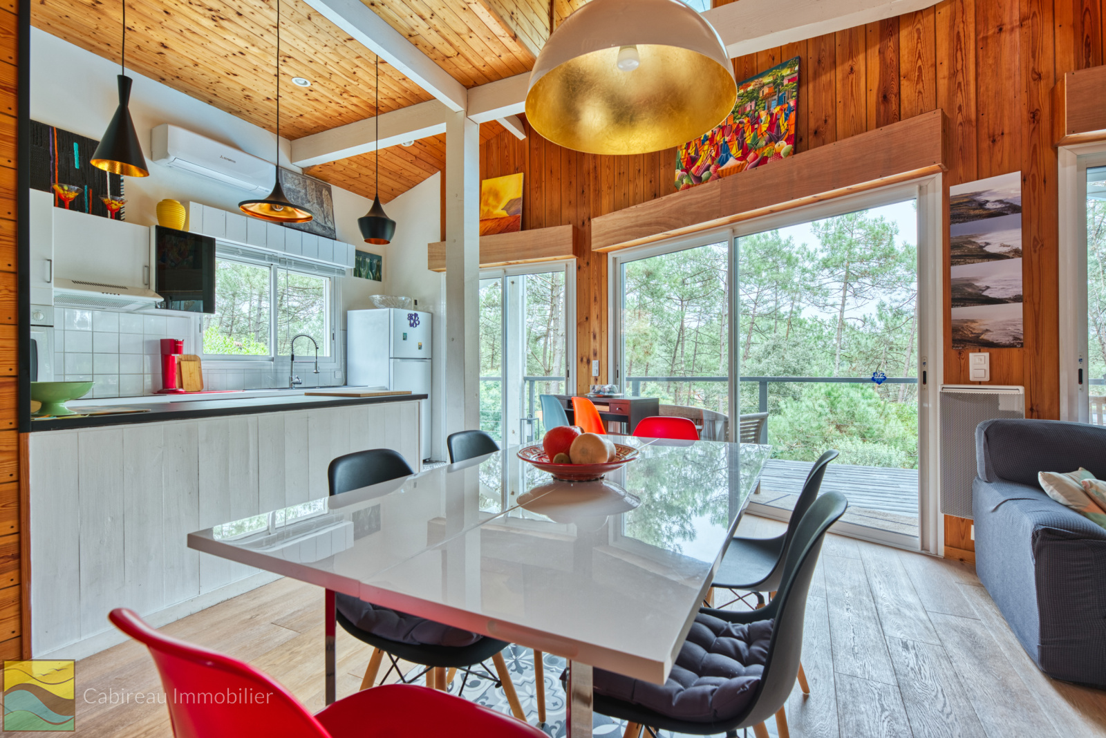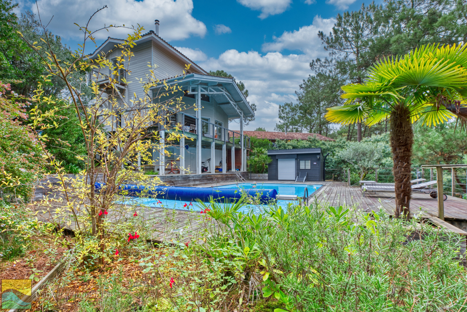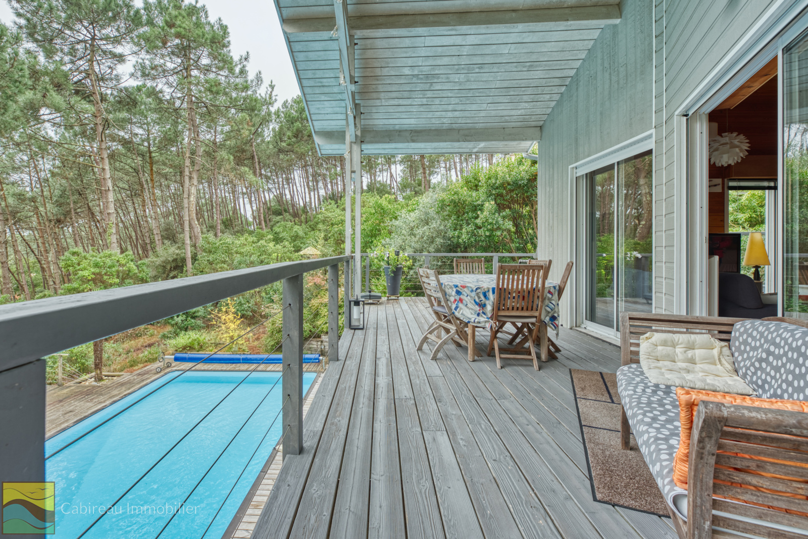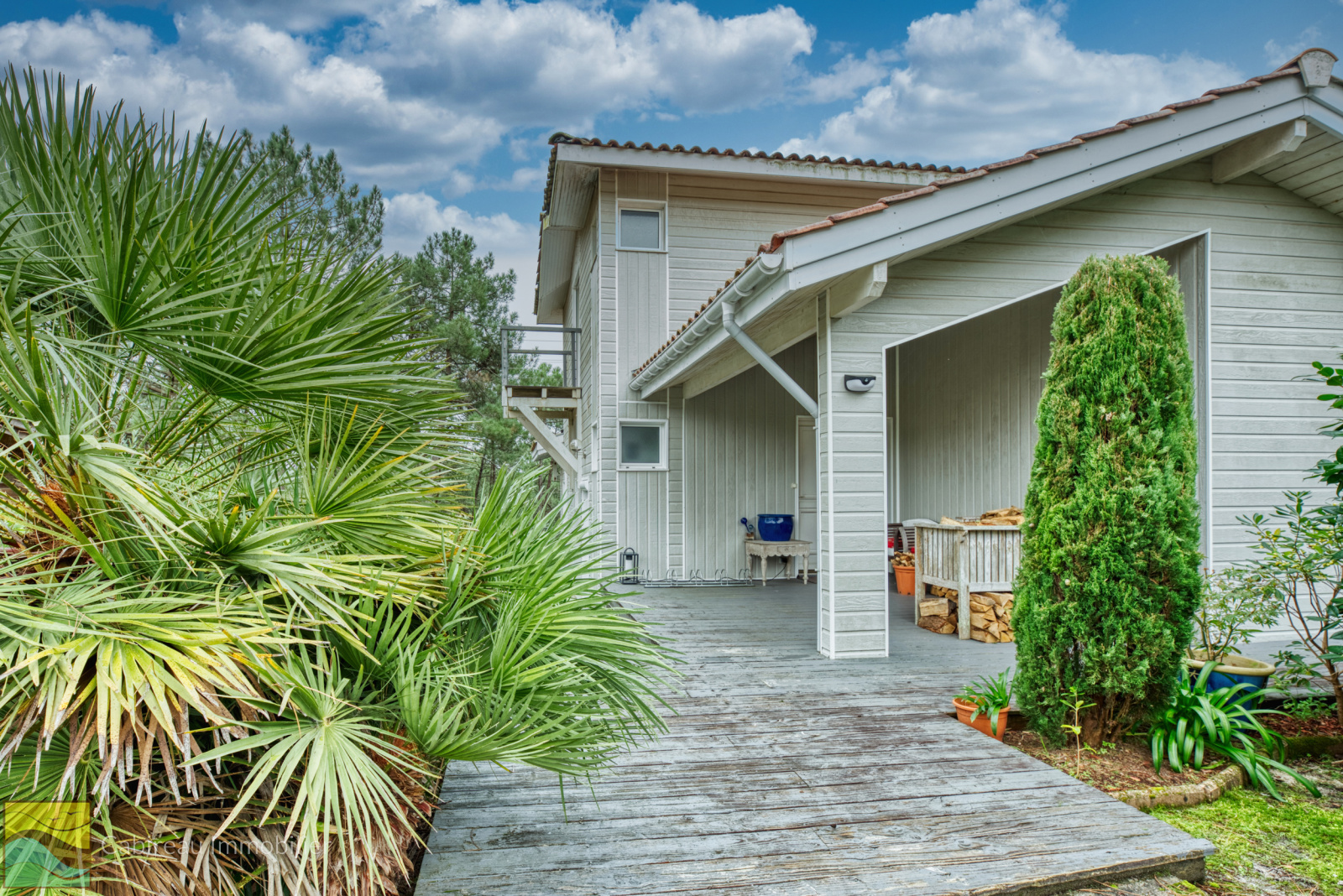 Lacanau ocean (33680)Dans un cadre naturel au cœur d'une pinède au calme, découvrez cette charmante maison à ossature bois construite en 1998, offrant une vue panoramique et un cadre de vie agréable. D'une surface habitable de 110 m², elle est implantée sur un terrain arboré de 1155 m², avec une piscine de 5x10 mètres entourée d'une vaste terrasse en bois de 126 m².