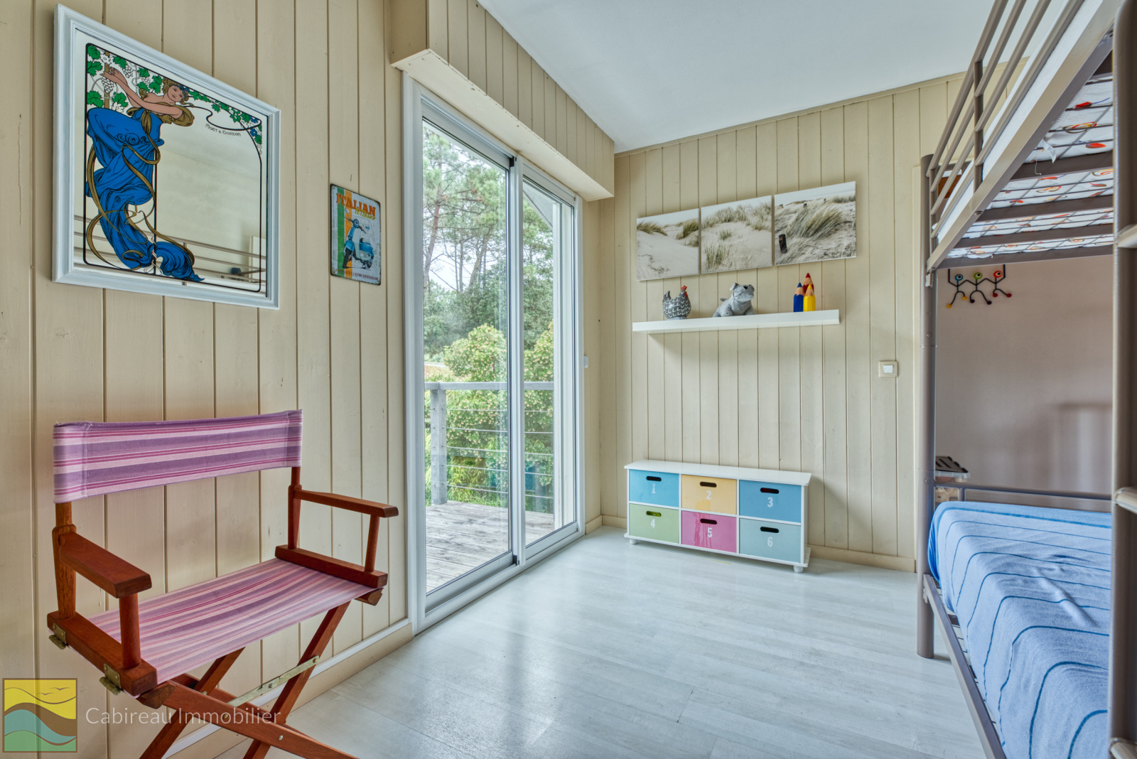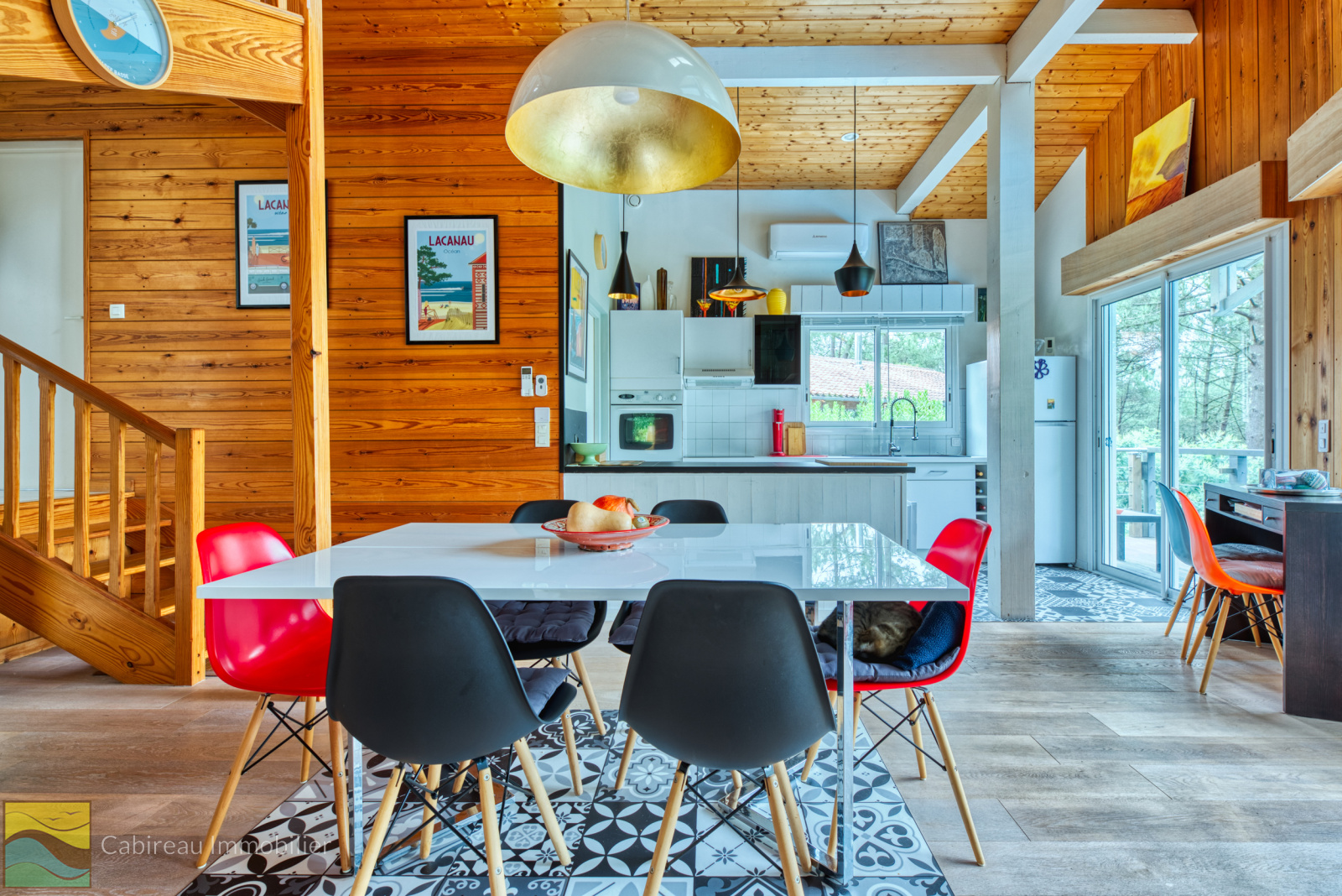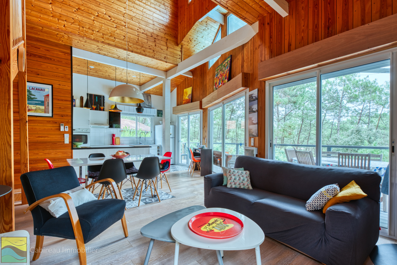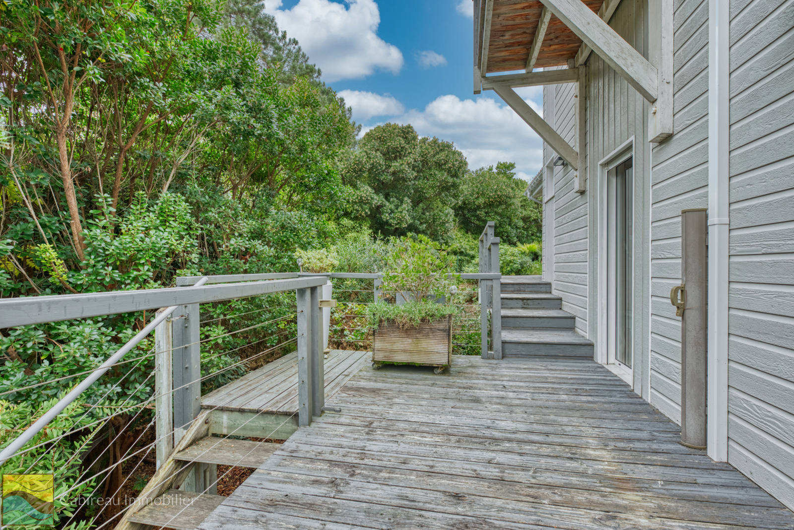 Lacanau ocean (33680)Dans un cadre naturel au cœur d'une pinède au calme, découvrez cette charmante maison à ossature bois construite en 1998, offrant une vue panoramique et un cadre de vie agréable. D'une surface habitable de 110 m², elle est implantée sur un terrain arboré de 1155 m², avec une piscine de 5x10 mètres entourée d'une vaste terrasse en bois de 126 m².