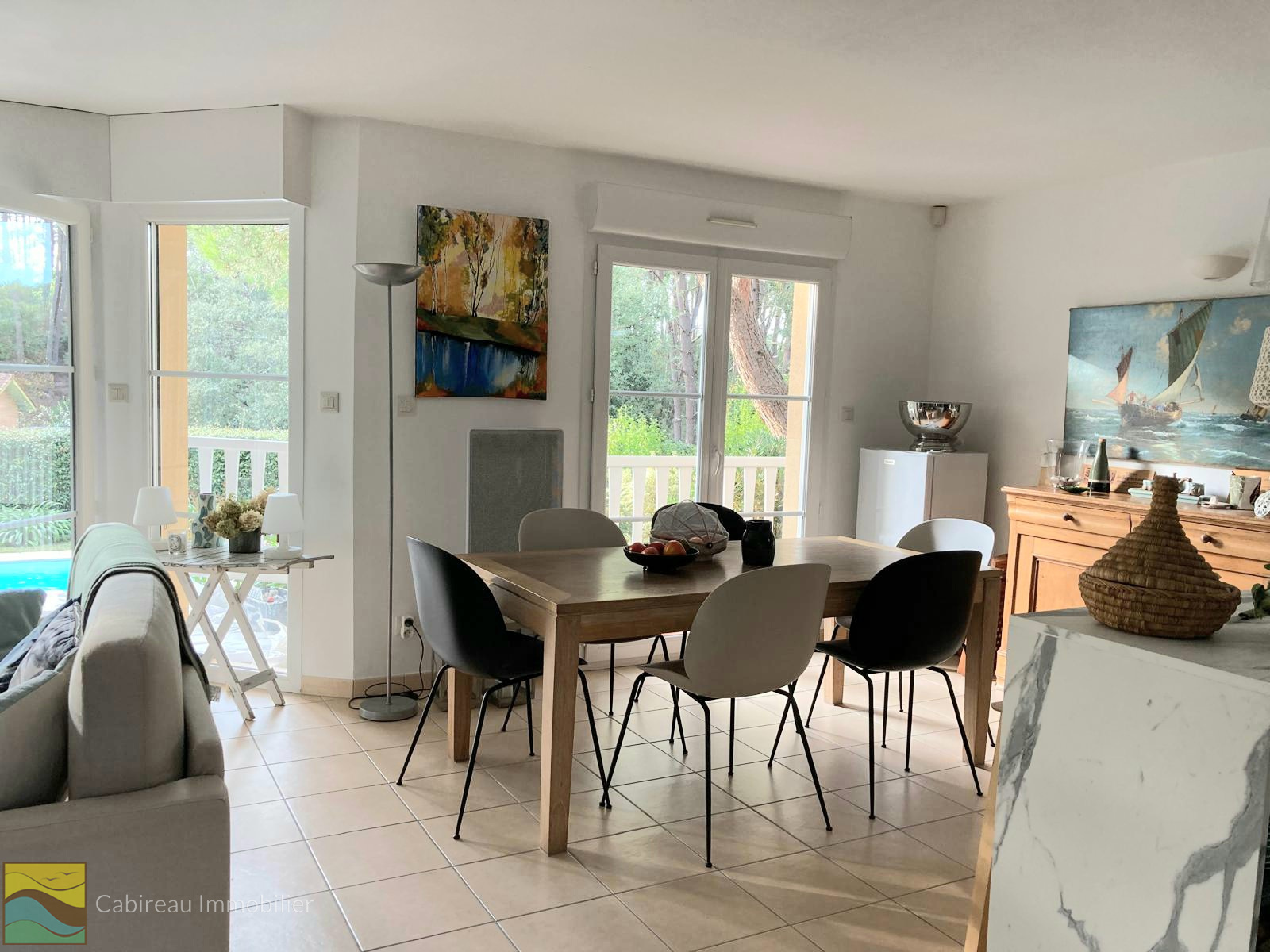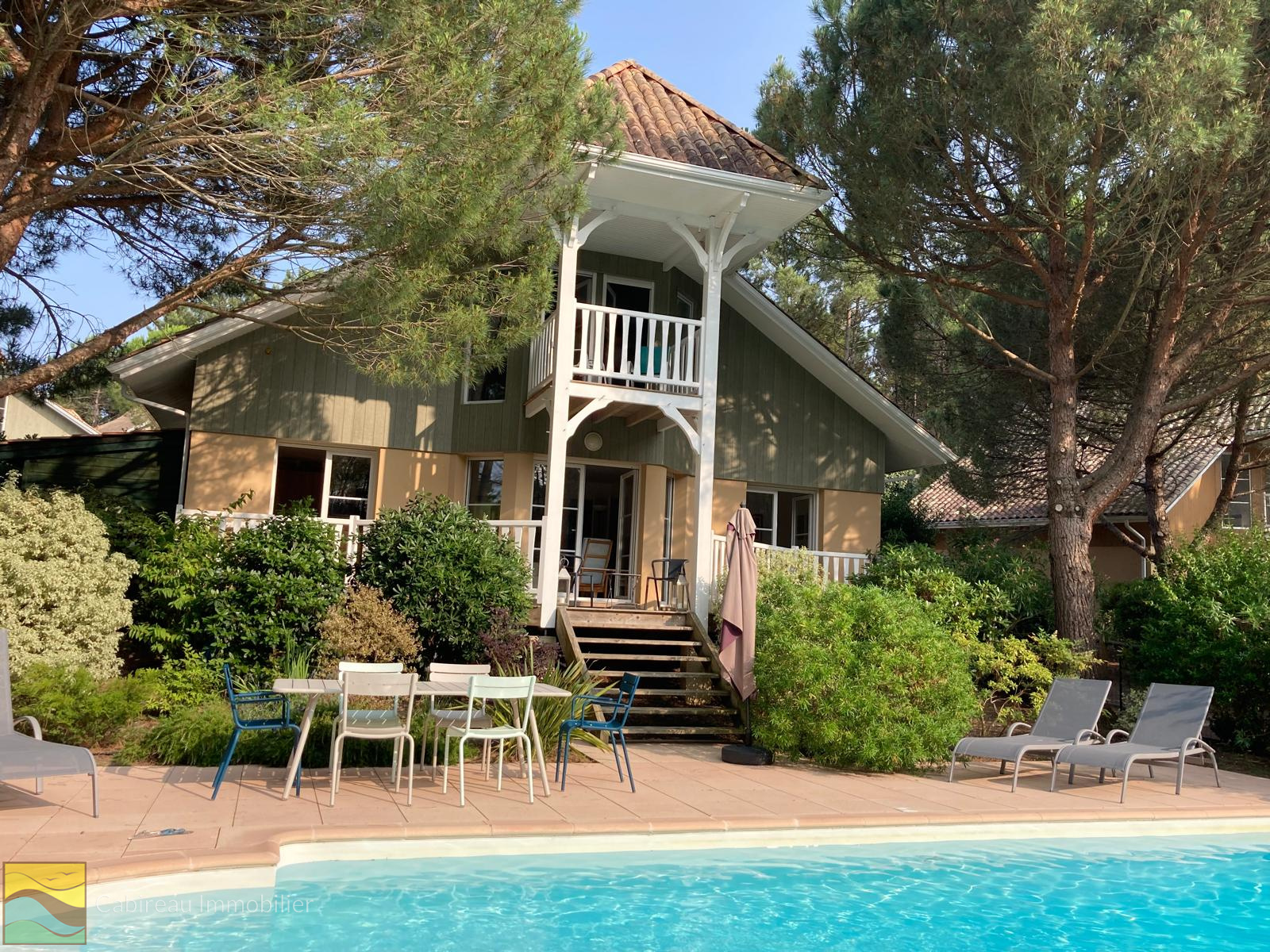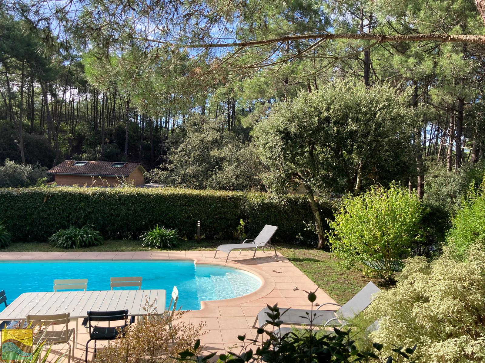 Lacanau ocean (33680)Dans un environnement naturel et calme, maison à étage agréable et fonctionnelle construite en 2006, d’une surface habitable de 97 m² sur un terrain arboré de 536 m² avec piscine de 8x4.