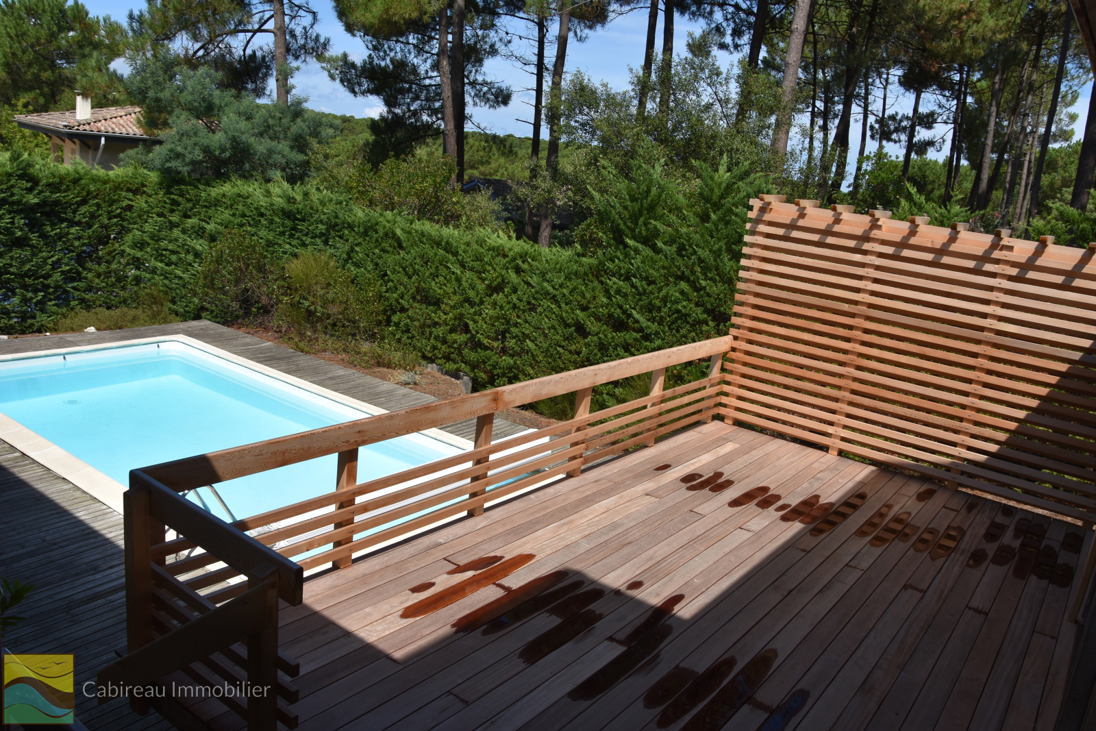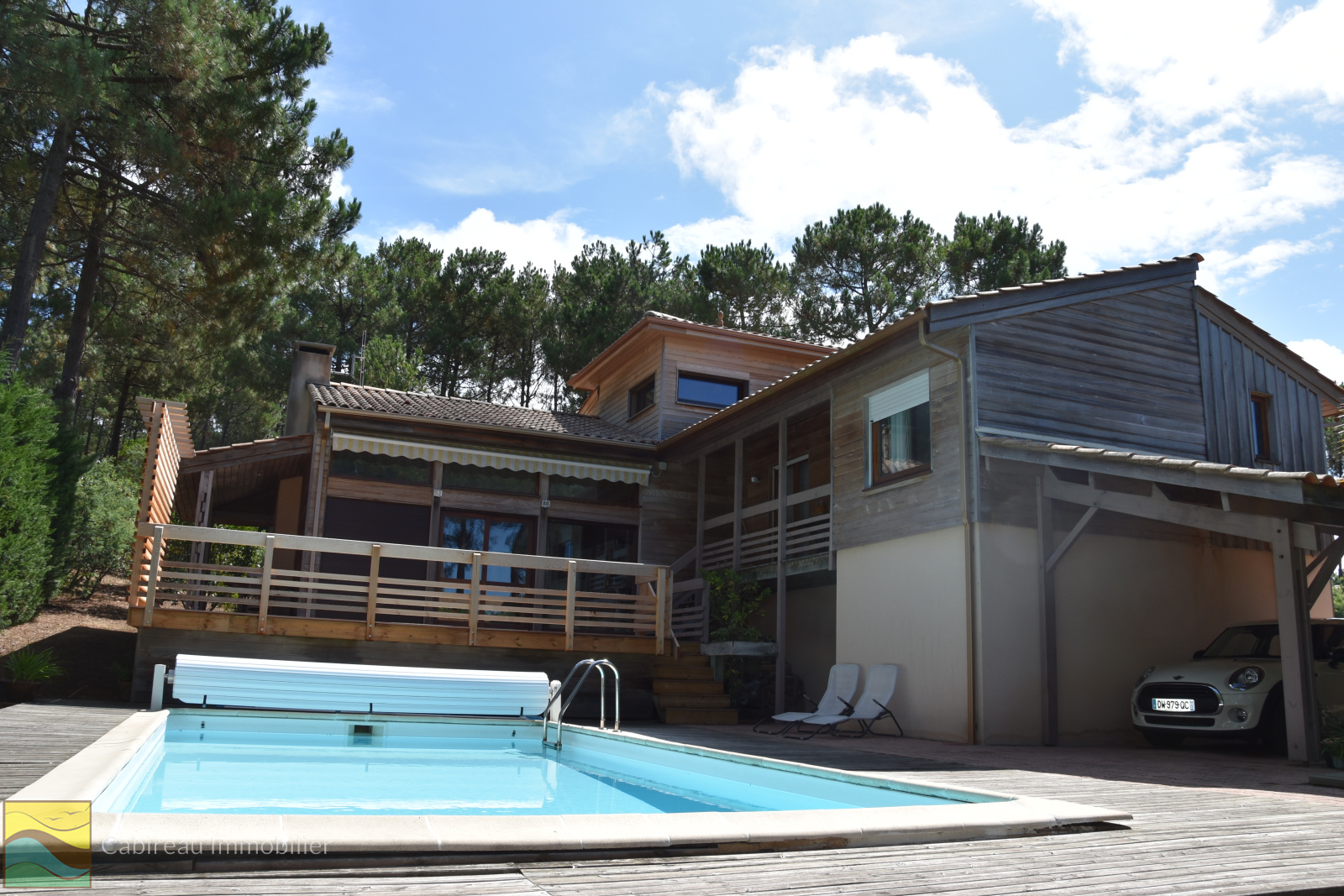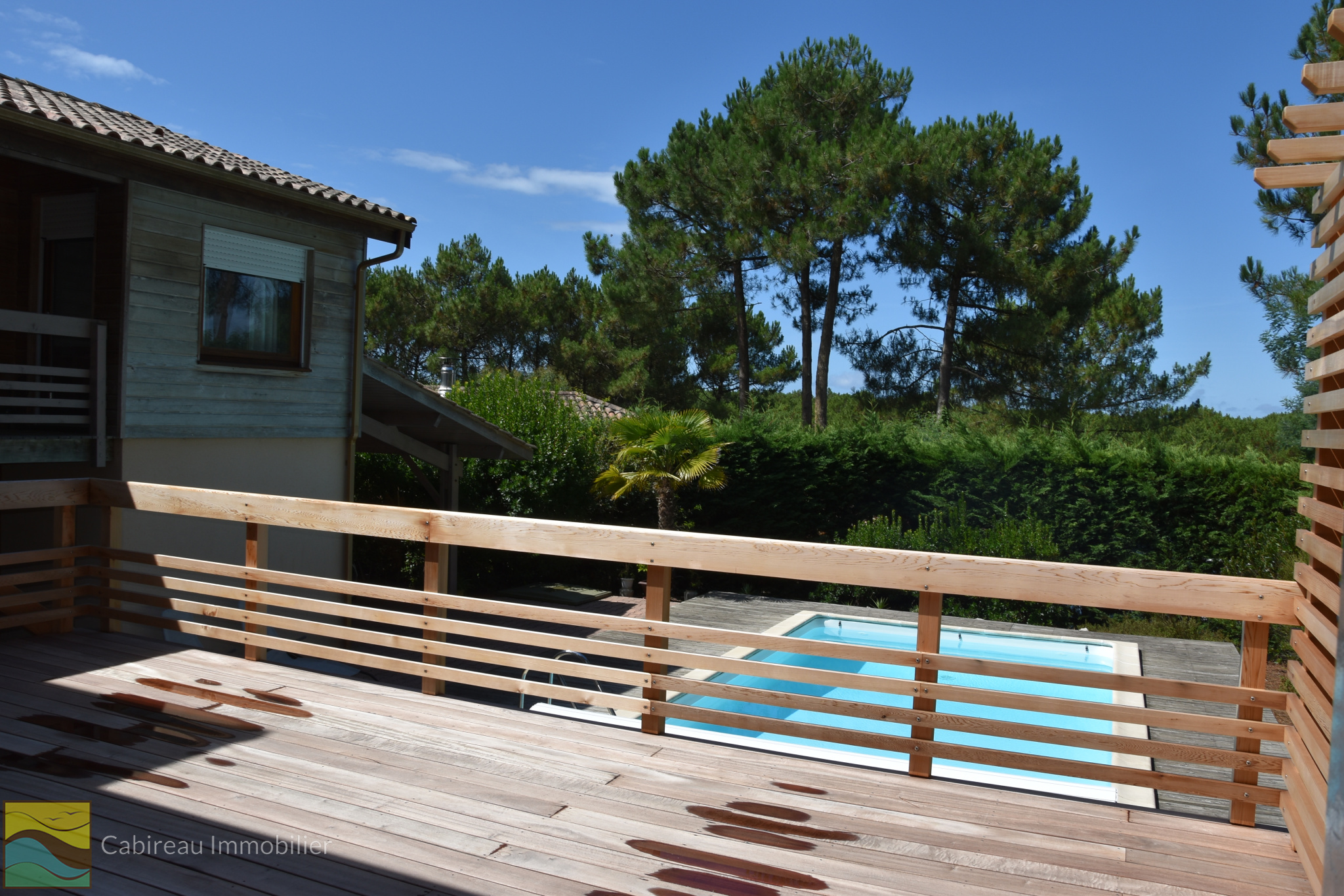 Lacanau ocean (33680)Dans la pinède, quartier résidentiel au calme, belle maison en ossature bois, surface habitable de 154 m² sur une parcelle de terrain de 977 m² dotée d'une piscine avec terrasse bois tout autour. La maison offre une belle pièce de vie de 57 m² comprenant une cuisine ouverte sur un séjour cheminée insert donnant sur terrasse, 4 chambres, 3 salles d'eau et une salle de bains, garage, buanderie et cave.