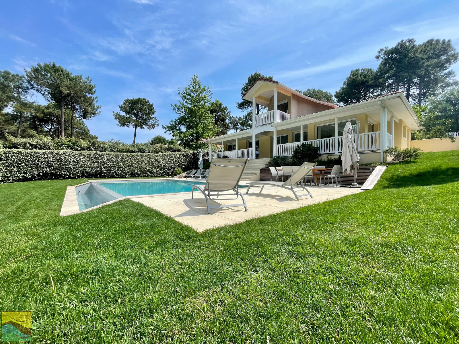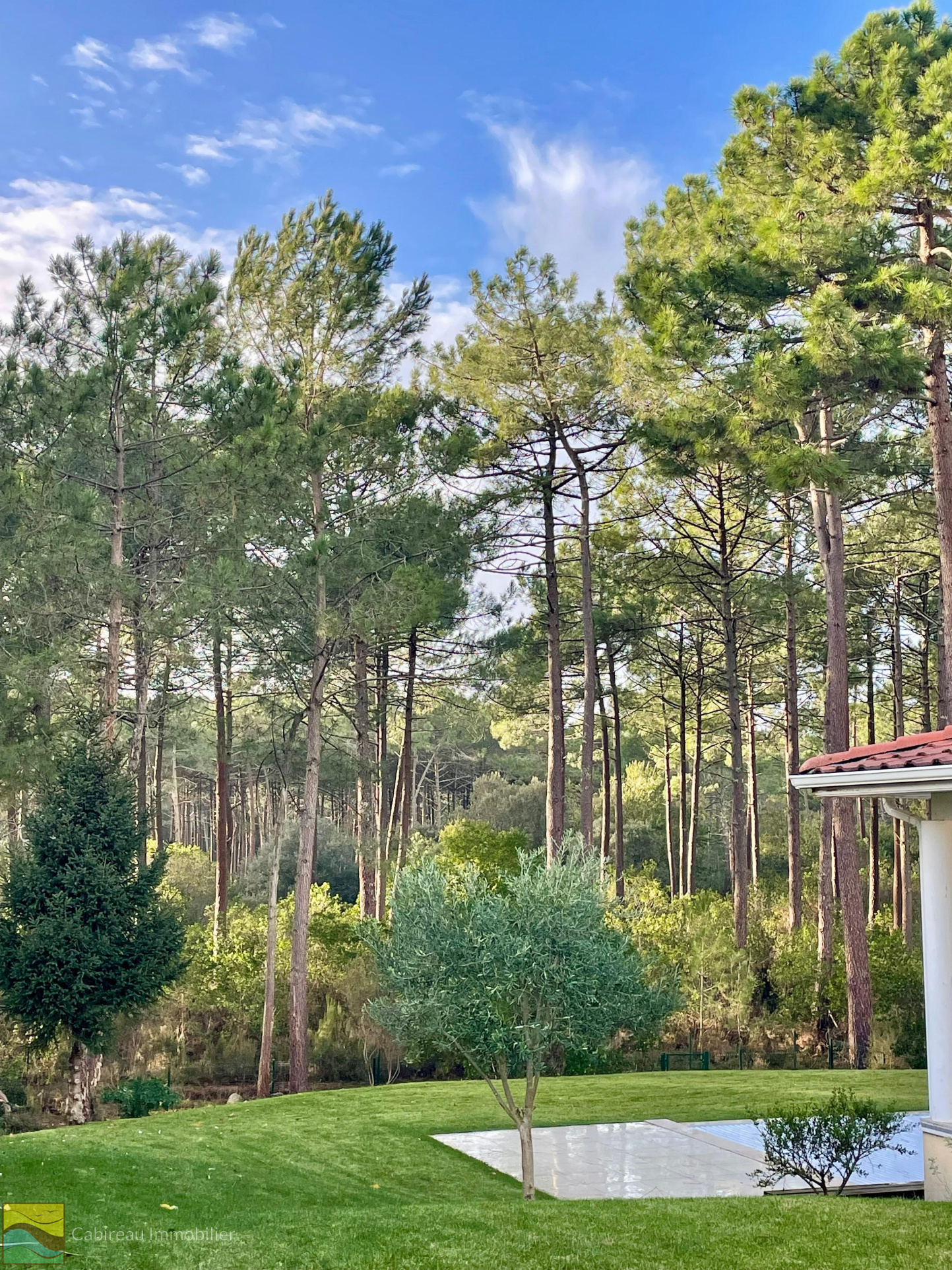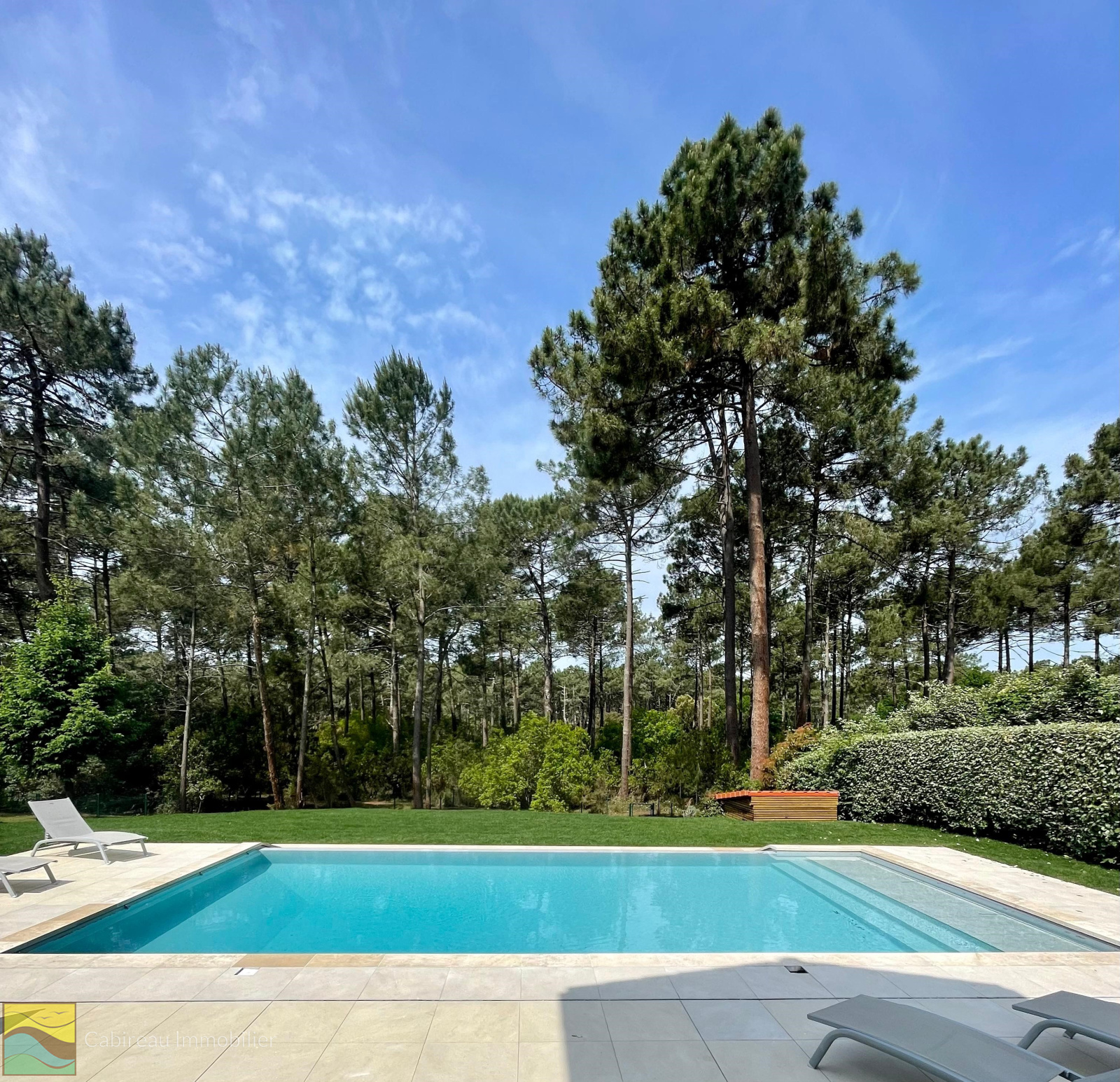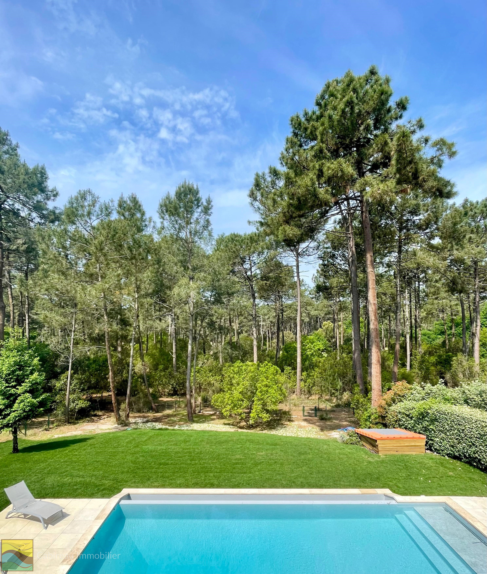 Lacanau ocean (33680)En Exclusivitré. Située dans un environnement calme et prisé, cette maison contemporaine de 5 chambres avec agencement optimisé d’une surface de 150 m², agrandie et rénovée en 2019, repose sur un magnifique terrain de 1 355 m² offrant une vue pinède en 1ère ligne du golf.