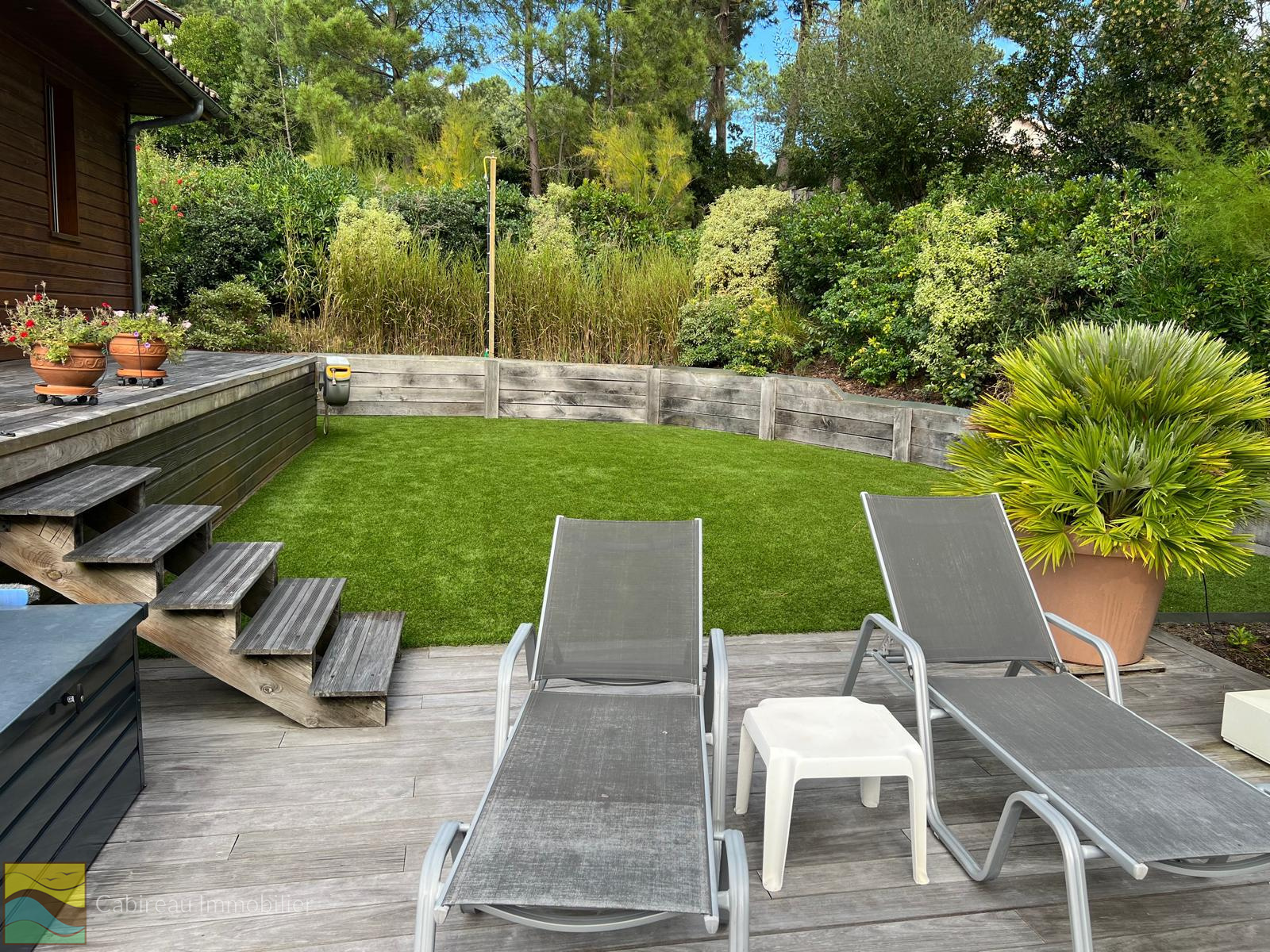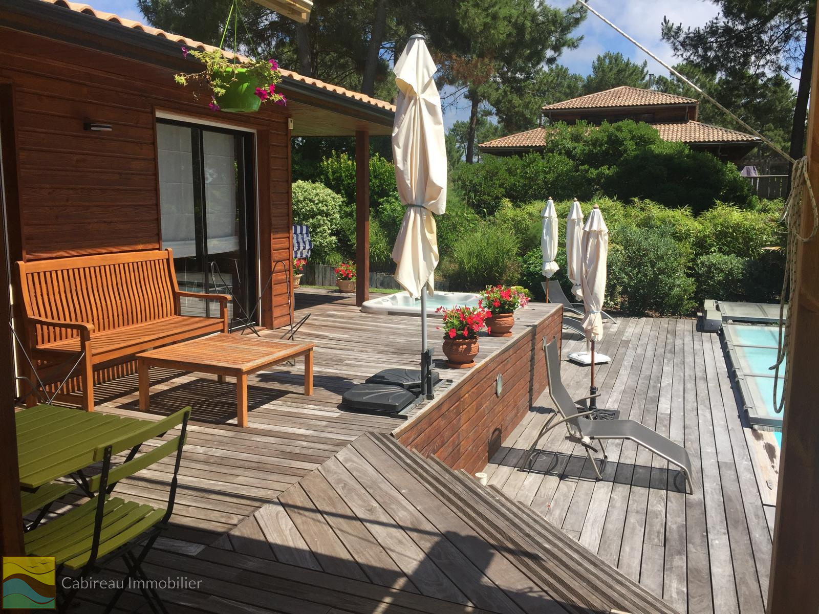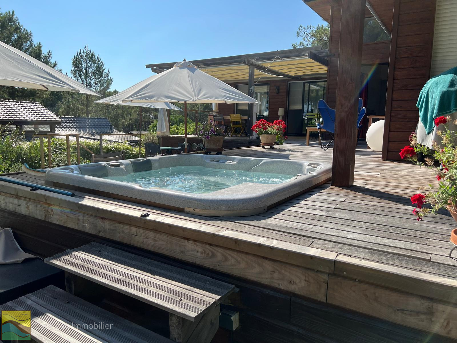 La maison dispose d’un jardin soigneusement paysagé à l’abri des regards, accueillant diverses terrasses en bois, un jacuzzi 4 places et une piscine chauffée au sel (9x4) équipée d'un abri piscine .